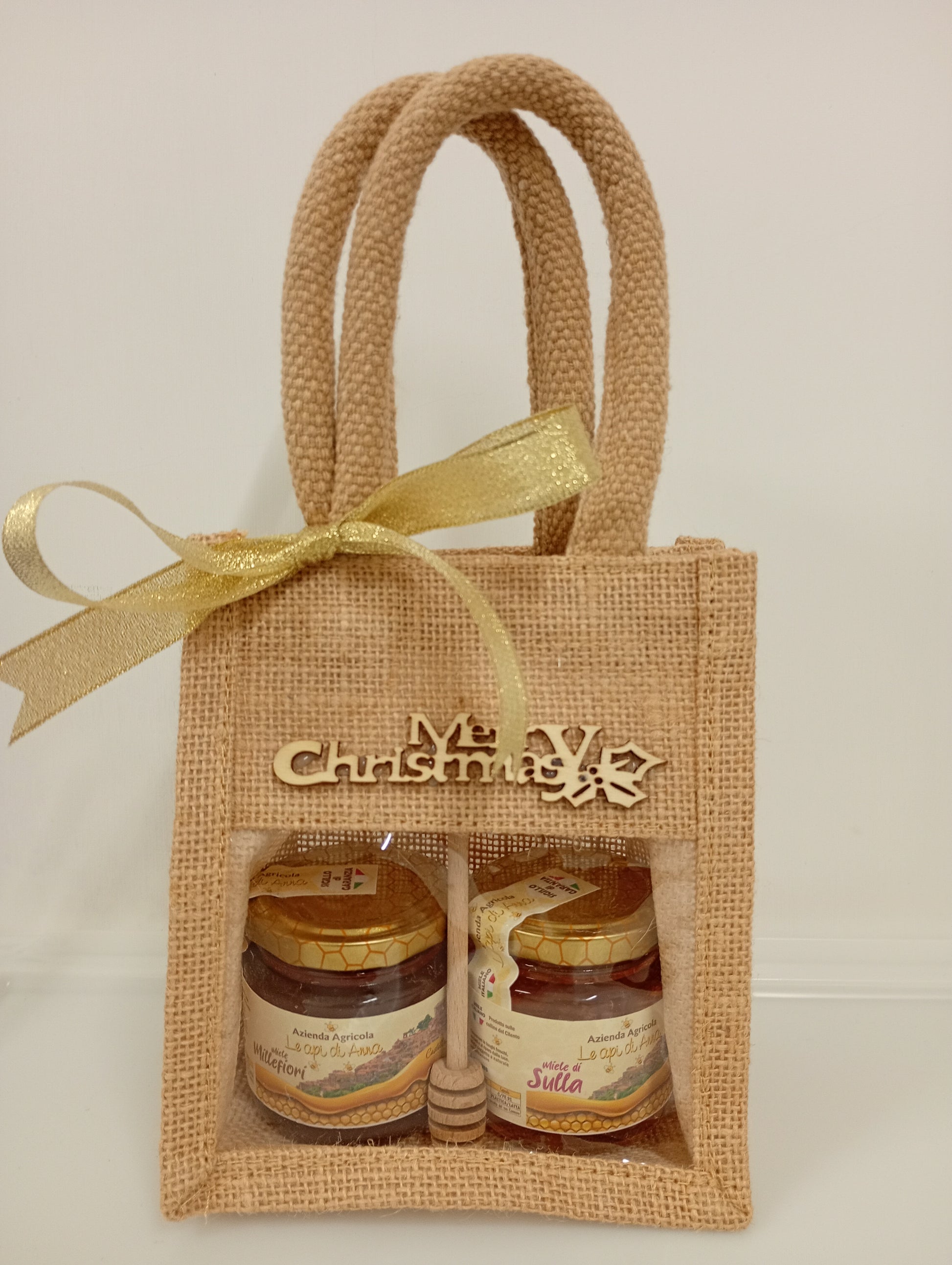 CONFEZIONE REGALO MIELE IN BORSA DI JUTA